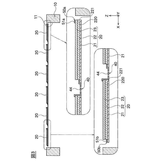 前記積層体は、複数の前記積層体からなり、複数の前記積層体は、前記積層方向に垂直な第1方向に配列され、前記導電パターンは、前記第1方向において、複数の前記積層体の間を橋渡ししてもよい。