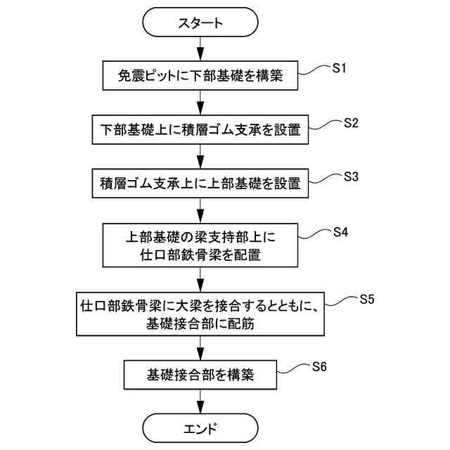 また、免震装置上にコンクリート造の上部基礎を配置して、上部基礎の梁支持部上に梁部材を配置して、この状態でコンクリートを打設することで、鉄筋コンクリート造の基礎接合部を構築する。このように、上部基礎をコンクリート造としたので、短工期で高精度な免震基礎構造を構築できる。