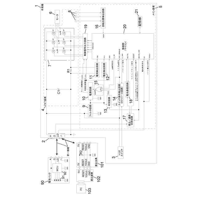 作業機1、電池パック90、書込治具101、書込装置102、及びPC103の回路ブロック図。