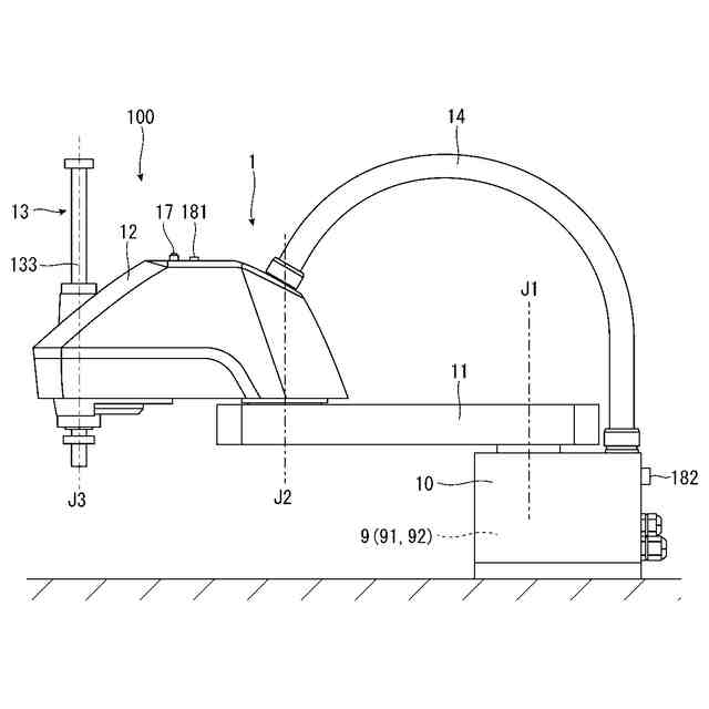 特許文献1に記載されたスカラロボット(水平多関節ロボット)は、基台と、基台に対して鉛直方向に沿う第1回動軸まわりに回動可能に連結された第1アームと、第1アームに対して鉛直方向に沿う第2回動軸まわりに回動可能に連結された第2アームと、を有する。また、第2アーム内には、スペーサーを介して第2アームの底部基材に固定されたジャイロセンサーモジュールが配置されている。