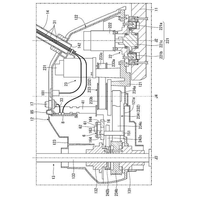 前記アームベースを前記第2回動軸に沿う方向に貫通するアームベース貫通孔を有し、