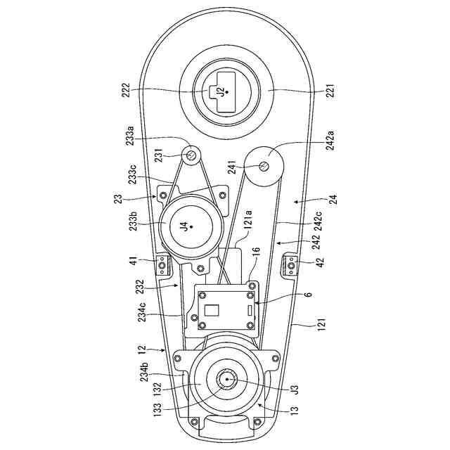前記載置部材は、前記第1ベルトおよび前記第2ベルトよりも前記第2回動軸に沿う方向の前記一方側に位置し、前記第2回動軸に沿う方向からの平面視で、前記第1ベルトおよび前記第2ベルトと重なり、