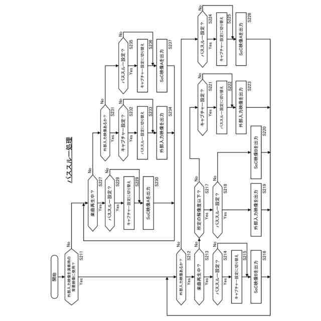 【解決手段】楽曲情報を再生する再生部と、外部入力映像を入力可能とする外部映像入力端子と、当該処理部で形成された処理部形成映像、もしくは、処理部形成映像と外部入力映像に基づいて形成された映像を、処理部出力映像として出力可能とする処理部と、表示部に出力可能な出力端子を備えるとともに、第1状態と、第2状態を切り替え可能な切替部と、を備え、第1状態は、外部入力映像を、処理部を経由せずに出力端子から出力させ、第2状態は、処理部から出力される処理部出力映像を出力端子から出力させ、第1状態の場合であって、再生部において楽曲情報が再生された場合、第1状態から第2状態に切り替える切替処理を実行する。