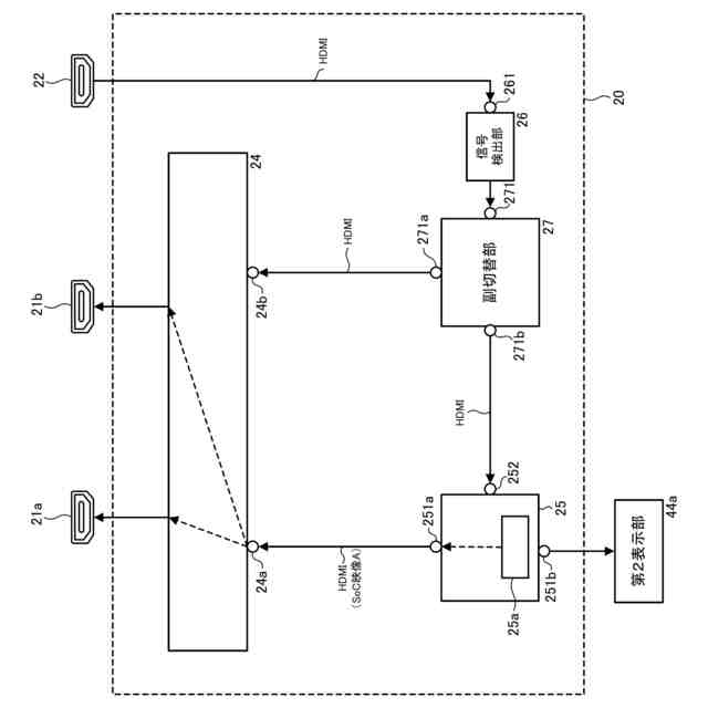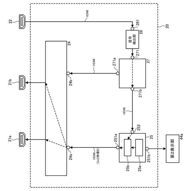切替部は、第2状態の場合であって、外部映像入力端子に接続される外部映像機器が所定の解像度以下の解像度に対応している場合、第2状態とする