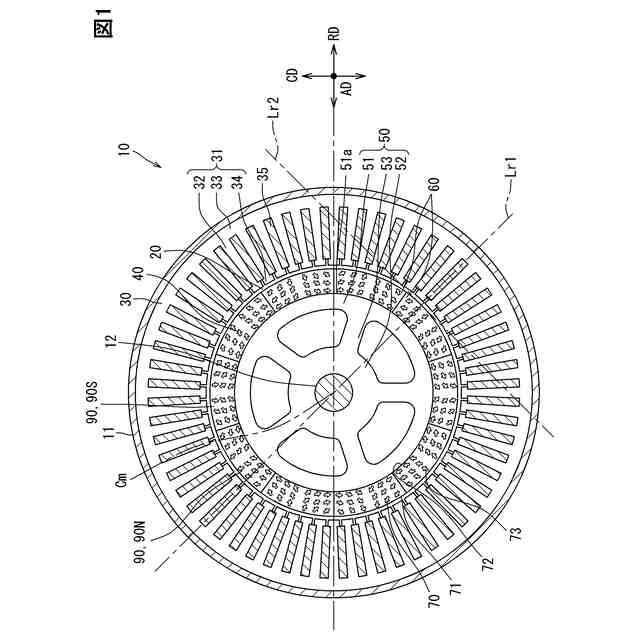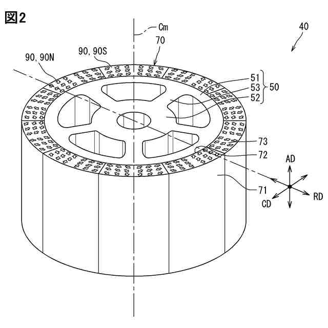 前記モータ磁石として、前記第1方向において前記第1表面から前記第2表面に向かう前記第1配向成分を有する複数の前記配向を備える第1モータ磁石(90S)と、前記第1方向において前記第2表面から前記第1表面に向かう前記第1配向成分を有する複数の前記配向を備える第2モータ磁石(90N)と、があり、