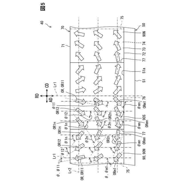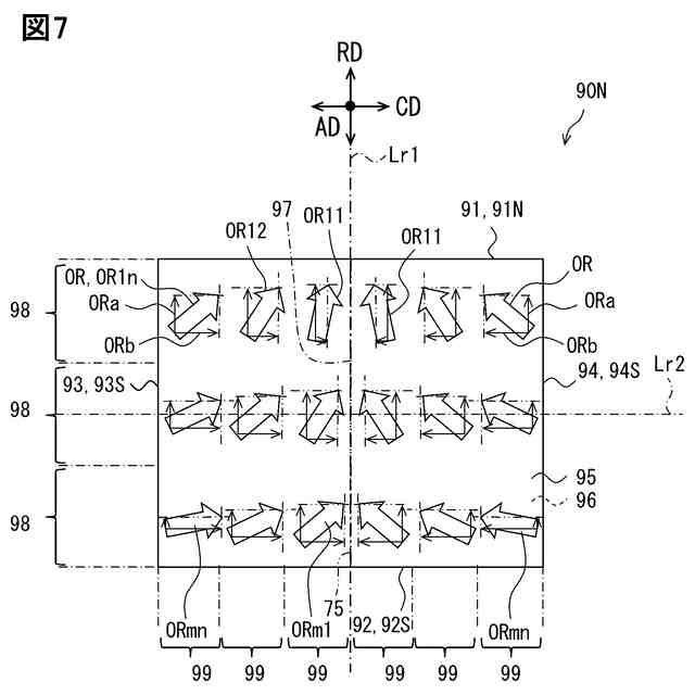 前記第1配向成分は、前記第1方向において、前記第1表面および前記第2表面の一方から他方に向かい、前記第1方向において、前記第1表面側よりも前記第2表面側の方が小さく、前記第2方向において、前記第1端部と前記第2端部との間の中央部(97)側よりも前記第1端部側と前記第2端部側それぞれの方が小さく、