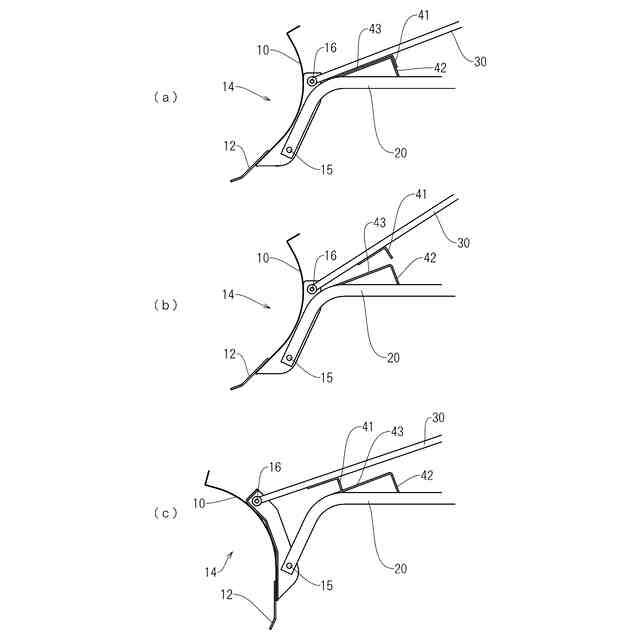 係合装置を進行方向左側から見たときの拡大図であり、(a)はブレード部が復帰位置で係合装置が係合状態、(b)はブレード部が復帰位置で係合装置が係合解除状態、(c)はブレード部が排出位置で係合装置のフックが滑走部上に位置した状態である。