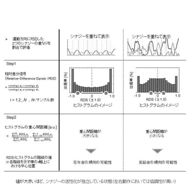 本発明の第2の実施の形態は、第1の実施の形態による舌運動機能評価装置において、協調性評価では、重なり割合を相対差分信号のヒストグラムにおける重心間距離によって評価するものである。舌運動には、舌そのものだけではなく舌の根元を支える舌骨上筋群等の周囲の複数の筋肉の協調運動が欠かせない。一方、加齢や麻痺によって舌の運動機能が低下していくことが確認されている。本実施の形態によれば、舌骨上筋群から抽出した筋シナジーの協調性を評価することで、舌運動機能における加齢変化や麻痺の影響を評価できる。