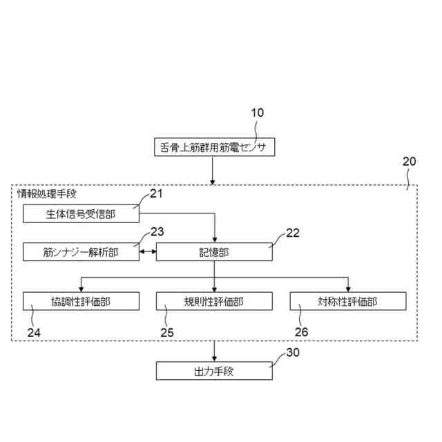 【解決手段】情報処理手段20では、舌を一方と他方に動作させる際の舌骨上筋群筋電センサ10からの生体信号を用いて筋シナジー解析を行い、舌を一方に動作させる際に活性化する一方筋シナジーと、舌を他方に動作させる際に活性化する他方筋シナジーとを抽出し、一方筋シナジーと他方筋シナジーは、空間パターンと時間パターンで表現され、一方筋シナジーの時間パターンと他方筋シナジーの時間パターンの重なり割合から評価される協調性評価、一方筋シナジーと他方筋シナジーの各時間パターンに対して動作周期ごとの活性化の類似度から評価される規則性評価、一方筋シナジーと他方筋シナジーとの前記時間もしくは前記空間パターンの類似度から評価される対称性評価の少なくともいずれか一つを評価対象として舌運動機能を評価する。
