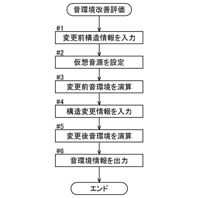 【解決手段】構造変更が行われる前の室内空間の形状および隔壁形態を少なくとも示す変更前構造情報をコンピュータに入力する工程と(#1)、室内空間の内部に仮想音源を設定してコンピュータに入力する工程と(#3)、変更前構造情報および仮想音源に基づいて、構造変更が行われる前の室内空間における音環境を示す変更前音環境情報をコンピュータに出力させる工程と(#4)、構造変更の内容を特定する構造変更情報をコンピュータに入力する工程と(#2)、構造変更情報および仮想音源に基づいて、構造変更が行われた後の室内空間における音環境を示す変更後音環境情報をコンピュータに出力させる工程と(#4)を備え、変更前音環境情報および変更後音環境情報は、聴覚的に出力される態様で出力される。