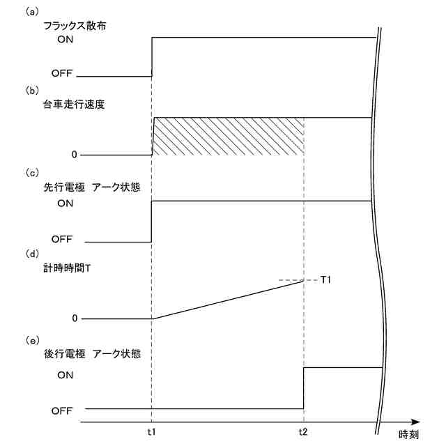 複数の電極を用いたサブマージアーク溶接においては、溶接開始時のいわゆるランニングスタートが知られている。ランニングスタートでは、まず、先行の電極がアークの発生を開始し、その直後に各電極を搭載した台車の走行が開始する。そして、後行の電極は、先行の電極のアークによって被溶接物に形成された溶融池上に到達したときに、アークの発生を開始する。