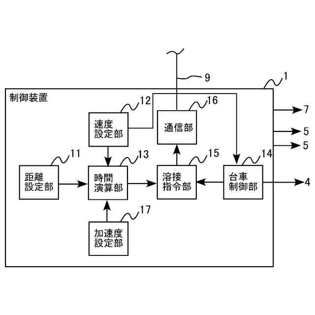 前記距離設定部は、前記台車の進行方向における、溶接開始点と前記散布装置のフラックス散布口との第1距離をさらに設定し、
