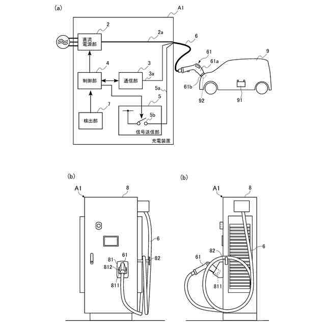 【解決手段】蓄電池91の電力で電動機を駆動して移動する電気移動体2の蓄電池91を充電する充電装置A1において、直流電力を出力する直流電源部2と、直流電源部2を制御する制御部4と、電気移動体2に接続されて、直流電源部2が出力する直流電力を当該電気移動体2に供給する充電コネクタ61と、充電コネクタ61が接続された電気移動体9に開始信号を送信する送信状態と送信しない非送信状態とで切り替えられる信号送信部5と、充電コネクタ61が収納された収納状態であるか、収納されていない非収納状態であるかを検出する検出部7とを備えた。制御部4は、検出部7の検出結果が収納状態から非収納状態に変わった場合に、信号送信部5を非送信状態から送信状態に切り替える。