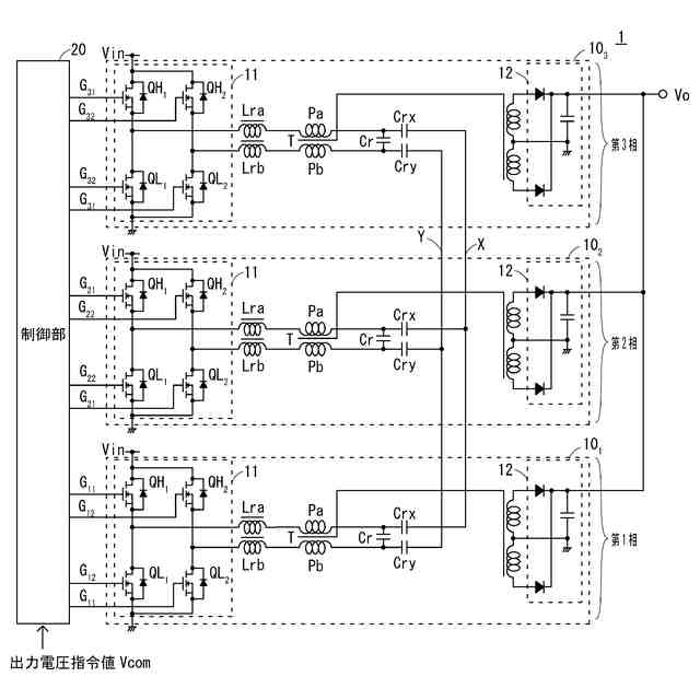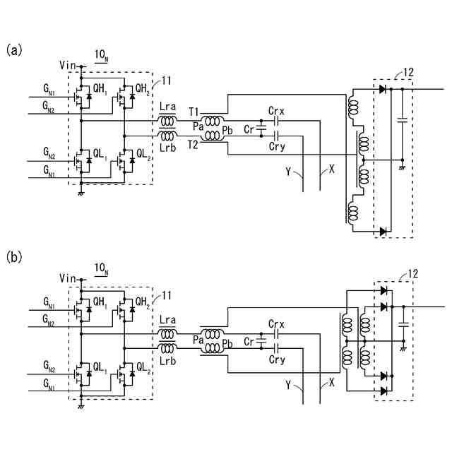 は、共振インダクタLra、Lrb、トランスTの一次巻線Pa、Pb及び共振キャパシタCrを含む直列共振回路が第1スイッチングレッグの出力点と第2スイッチングレッグの出力点との間に接続される。N個のLLC回路10