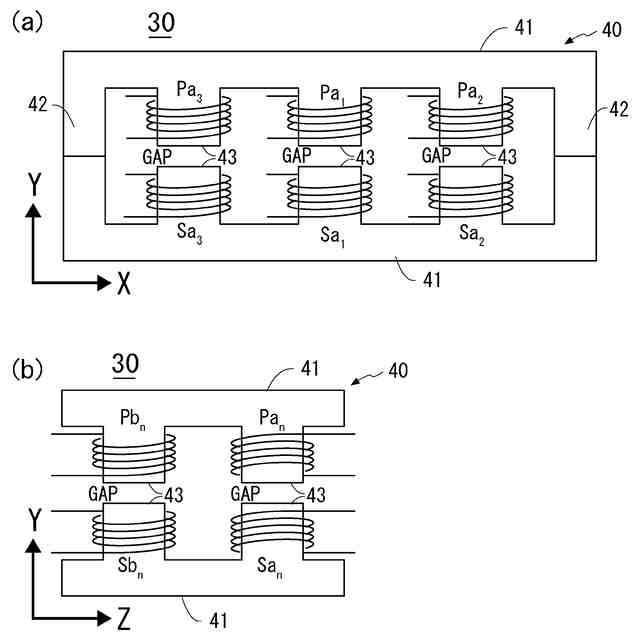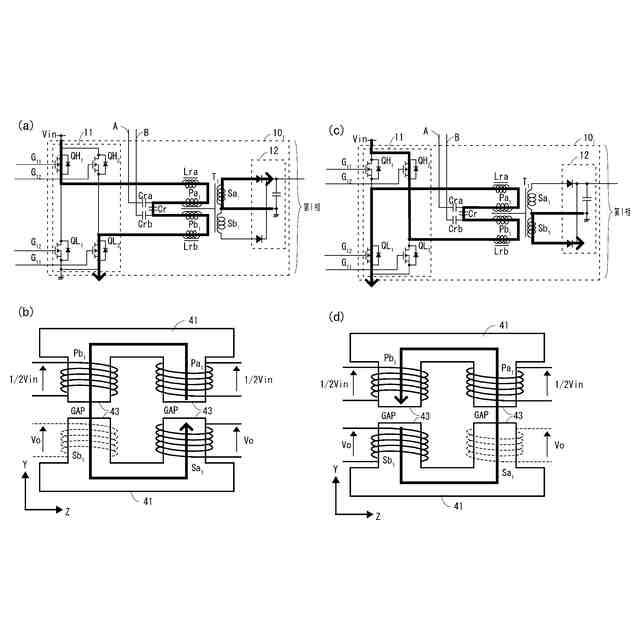 【解決手段】電力変換器は、トランスを有するLLC回路をN個(Nは2以上の自然数)備える。N個のLLC回路のトランスは、ギャップを有する中脚43がX方向及びZ方向にマトリックス状に配置された多脚トランス30に統合されている。多脚トランス30において、列方向に隣り合う中脚43には、発生する磁束の向きが逆になるようにトランスの一次巻線Pa