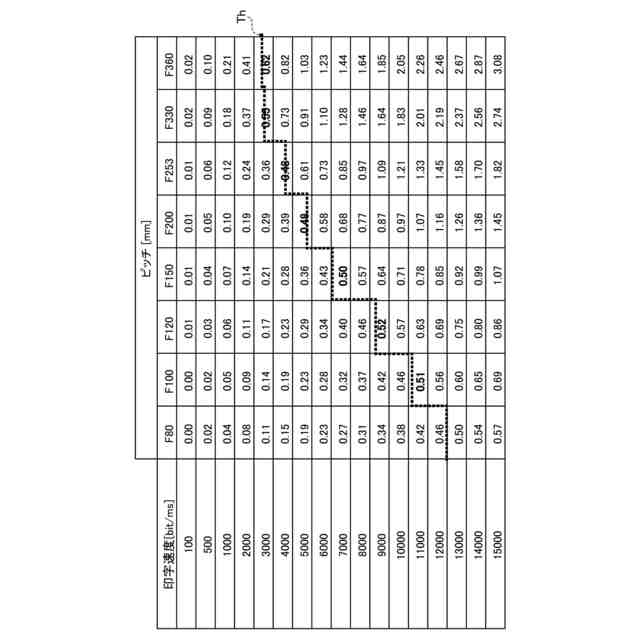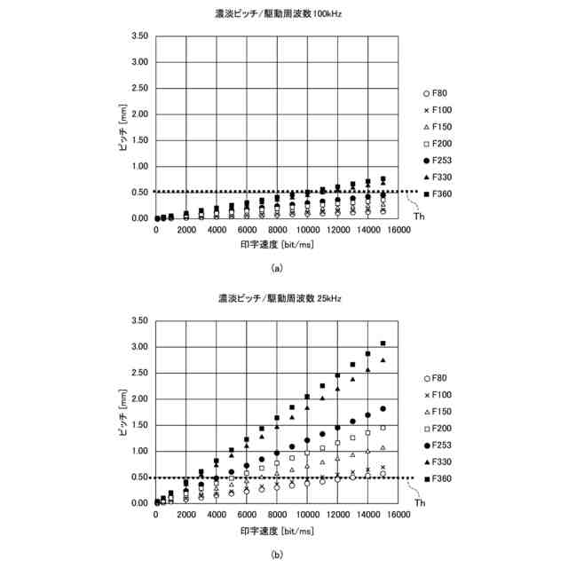 PWM信号の駆動周波数が100kHzである場合((a))と25kHzである場合((b))のfθレンズのF値をパラメータとする、印字速度と濃淡ピッチとの相関関係を示す図である。