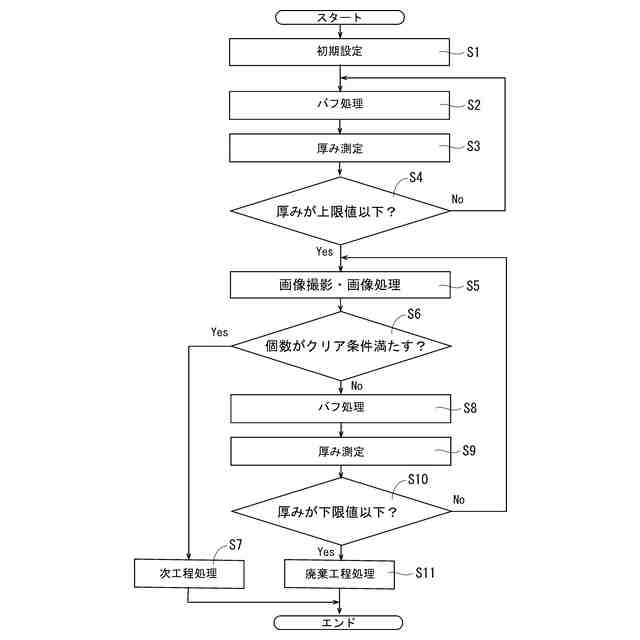 前記制御装置は、前記性状がクリア条件を満たさなければ、前記厚みが下限値を上回っている限り、前記作動機構に前記研磨処理を実行させ、