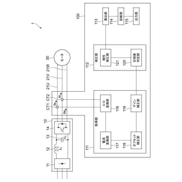 三相交流に接続されるモータを搭載した機器の劣化を診断する場合に、作業スペースやコストの観点から、2つの電流検出器を用いて三相交流の2相分の電流を取得し、取得した2相分の電流から残り1相分の電流を算出して機器の劣化を診断することがある。2相分に対する電流検出器の取り付け方向を正しい関係で設置しなければ残り1相分の電流を正しく算出することができず、算出した残り1相分の電流を用いて劣化を診断する場合に正確な診断ができない。
