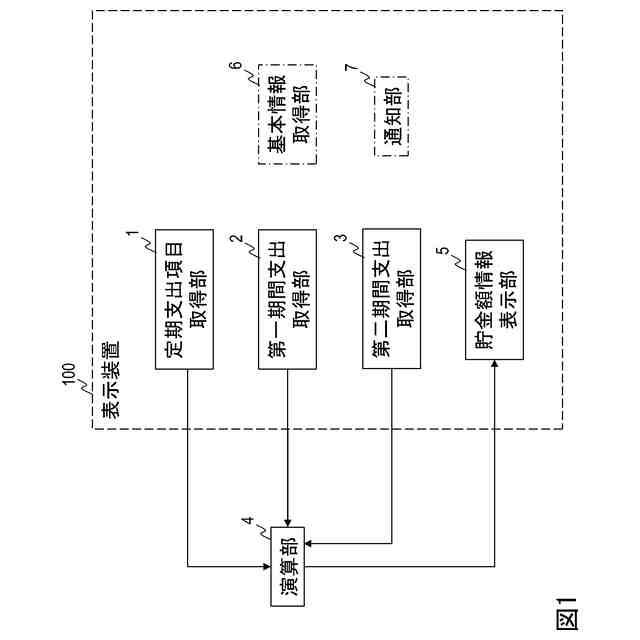 家計管理装置は、図1に示すように、定期支出項目取得部1、第一期間支出項目取得部2、第二期間支出項目取得部3、演算部4及び貯金額情報表示部5を例えば備えている。家計管理装置は、図1に破線で示す表示装置100を備えていてもよい。この場合、定期支出項目取得部1、第一期間支出項目取得部2、第二期間支出項目取得部3及び貯金額情報表示部5は、表示装置100による表示により実現されてもよい。表示装置100は、液晶ディスプレイ(LCD)、LEDディスプレイ、プラズマ(PDP)ディスプレイ、電子ペーパー等の表示装置である。