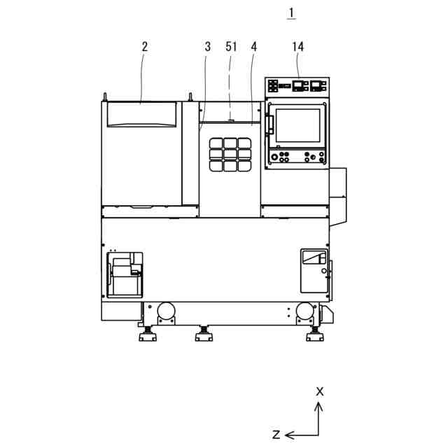 工作機械1は、タレット型の旋盤であり、図1、図2に示すように、機体カバー2、加工用装置である主軸装置11、タレット装置12、及び位置決め装置13、操作表示装置14、制御装置30を主に備えている。機体カバー2の内部には、ワークが加工される加工室が形成されている。加工室は、後述する、主軸装置11の主軸チャック20、タレット装置12の刃物台21を収容する空間でもある。また、加工室における機体の正面部にはワーク投入開口3が設けられており、このワーク投入開口3には、機体幅方向にスライドする開閉扉4が設けられている。