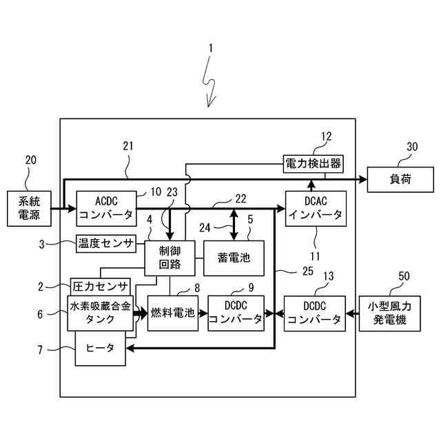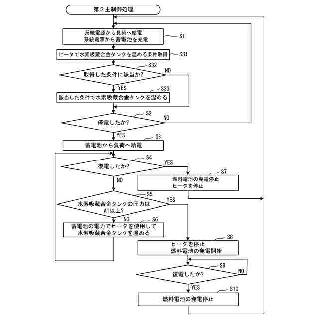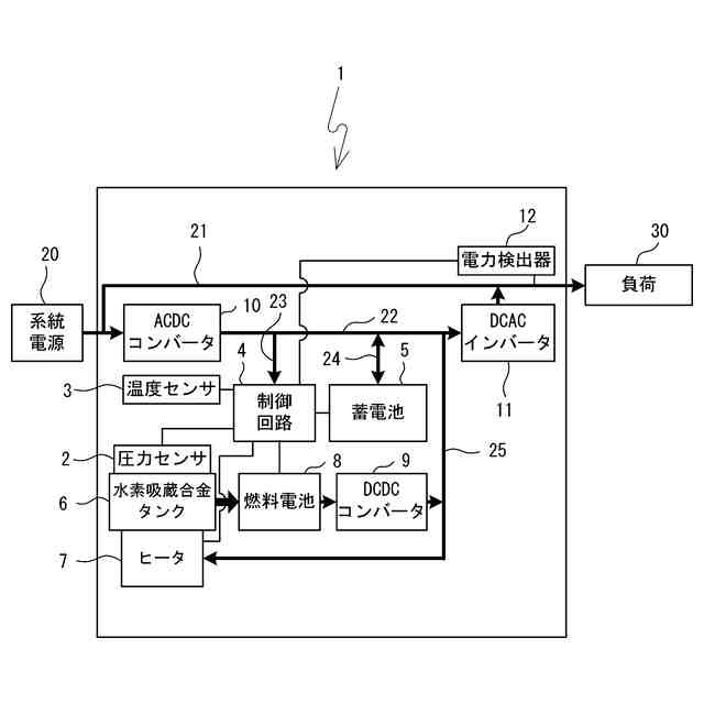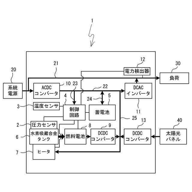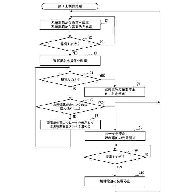 特許文献1には、燃料電池を用いた交流無停電電源システムが開示されている。当該交流無停電電源システムでは、商用交流電源の停電発生から規定時間を経過する間は、バッテリが電力を負荷に供給し、その後復電しない場合は、燃料電池が起動されて電力を負荷に供給する。燃料電池に供給される水素は水素吸蔵合金で貯蔵されるため、水素吸蔵合金のタンクの温度が一定未満になると、燃料電池に十分な水素を供給できない。交流無停電電源システムでは、予測ができない停電に備えて、水素吸蔵合金のタンクをヒータで保温して、タンクの温度を一定以上にしている。