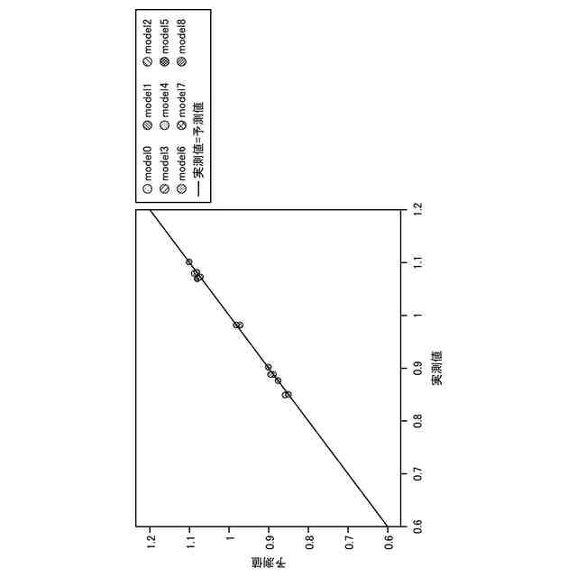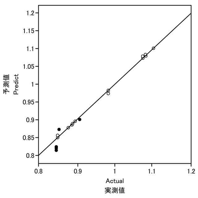 図2は、テストデータに対する重回帰モデルの回帰精度を示す図である。縦軸が予測値、横軸が実測値である。黒丸はテストデータのプロットを、白丸は訓練データのプロットを、それぞれ示す。
