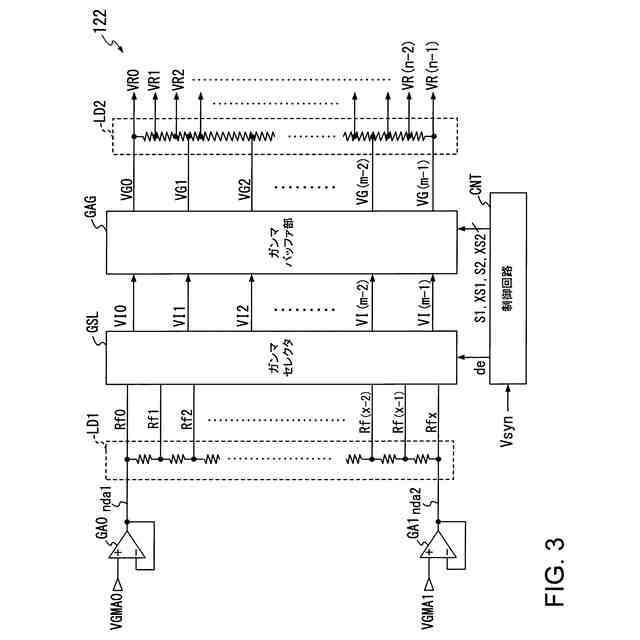 尚、上記した階調電圧生成部として、複数の抵抗が直接に接続されてなる第1及び第2のラダー抵抗、セレクタ、及びガンマアンプ群含むものが提案されている(例えば特許文献1の図3参照)。特許文献1の図3に記載されているセレクタは、第1のラダー抵抗107で生成された複数の電圧のうちから、所望とするガンマ特性に沿った電圧値を有する6個の電圧(V2~V7)を選択し、夫々をガンマアンプの各々(A1~A6)に個別に供給する。ここで、各ガンマアンプによって増幅された電圧群は第2のラダー抵抗153における所望とするタップの各々に印加され、この際、当該第2のラダー抵抗の各タップに生じた電圧が上記した複数の階調電圧として出力される。