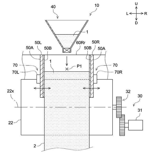 図1および図2に示すように、成形装置10は、一対の成形ロール21,22と、回転装置30と、材料の供給装置40と、一対のセキ板50L,50Rと、前壁60Fおよび後壁60Rrと、振動装置70と、を備えている。一対の成形ロール21,22は、それぞれ、円柱状に構成されている。一対の成形ロール21,22は、それぞれの外周面21a,22aで材料1を圧縮し、材料1をシート状に成形する。一対の成形ロール21,22は、予め定められた間隔をあけて、軸線方向を揃えるように配置されている。一対の成形ロール21,22の間の隙間に材料1を供給し、一対の成形ロール21,22を回転させることにより、材料1は圧縮され、一対の成形ロール21,22の間の間隔に対応した厚みを有するシート状に成形される。