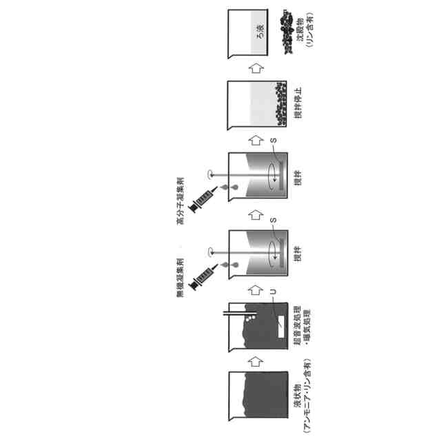 この方法によれば、アンモニアとリンを含有する液状物に超音波処理を施すことにより、まず液状物からアンモニアをストリッピングし、アンモニアをストリッピングした液状物に対して、無機凝集剤を添加した後に高分子凝集剤を添加することにより、液状物に含有されるリンを沈殿物として回収する効率(リンの凝集効果)を向上させることができる。これにより、アンモニアとリンを含有する液状物から、リンを効率よく回収することが可能になる。また、この場合、ろ液の濁度を低くすることができる(ろ液を清澄にできる)ため、ろ液の成分を排水基準に適合させることができれば、ろ液を河川などに放流(排水)することも可能になる。
