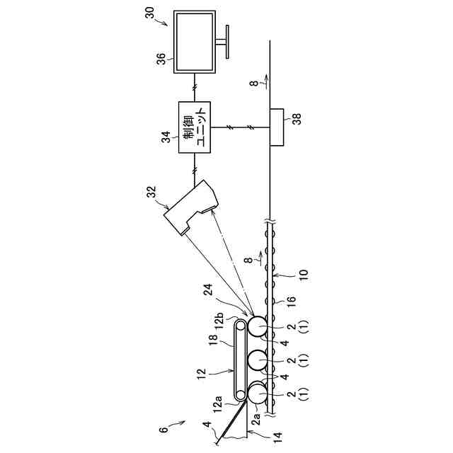 図1は、ラベリング装置6及び検査装置30の概略図を示す。ラベリング装置6は、香味供給物品を収容した容器1を複数パッキングした容器包装体2にラベル4を貼り付ける。詳しくは、ラベリング装置6は、容器包装体2の搬送経路8を形成するローラコンベア10と、ローラコンベア10の上側に配置されたベルトコンベア12と、ラベル4を供給するラベル供給ユニット14とを備えている。