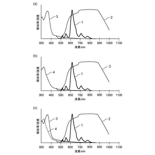 (a)乃至(c)本発明の一実施形態に係る有機発光素子の発光スペクトル、有機発光素子が有する有機層の光吸収スペクトル、及び感光体の光吸収スペクトルである。