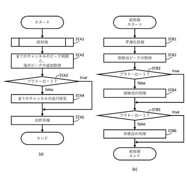 本願発明の第3の側面は、第1又は第2の側面の拍動分析装置であって、前記測定装置は複数存在し、当該拍動分析装置は、並行処理部を備え、前記各測定装置は、被測定者の異なる位置で、前記被測定者において内臓の収縮及び/又は弛緩が周期的に繰り返されたことを測定して測定信号を得、前記前処理部は、前記各測定装置が得た測定信号を個別に処理して、前記各測定装置に対応するピーク点を得、前記並行処理部は、前記各測定装置に対応するピーク点を同期し、前記各測定装置に対応するピーク点について、他の測定装置に対応するピーク点を参照して維持、追加、変更及び削除する。
