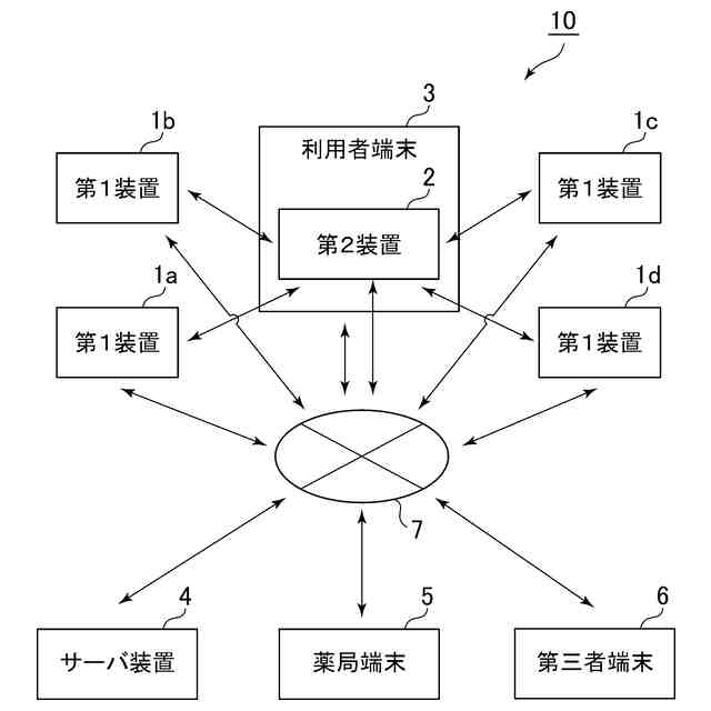 図1は、本発明の実施の形態にかかるシステムの構成を示すブロック図である。図1に示すシステム10は、4つの第1装置1(1a~1d)と、第2装置2と、利用者端末3と、サーバ装置4と、薬局端末5と、第三者端末6とから構成されている。図示するように、第2装置2は、利用者端末3に備えられている。