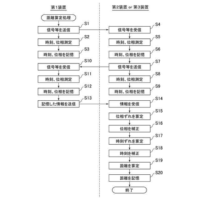 [6]第1距離算出手段及び/又は第2距離算出手段が、1の第1装置の時計と、第2装置及び/又は第3装置の時計との時刻のずれを基に距離を算出するものである、前記[4]又は[5]に記載のシステム;