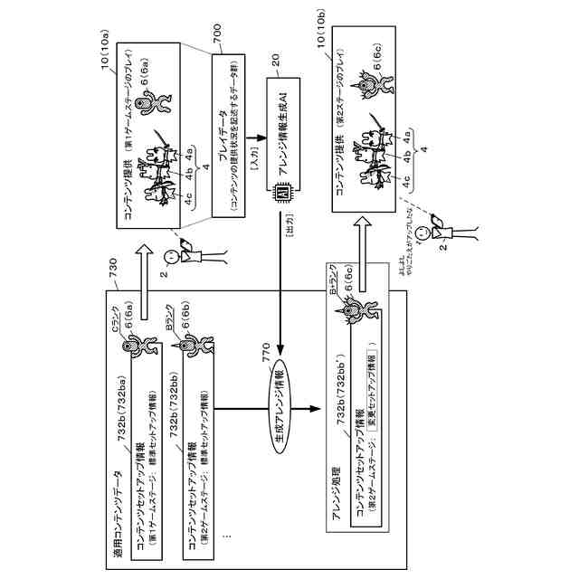 【解決手段】コンテンツ提供システムは、コンテンツの所与のプレイデータ700に応じてアレンジ情報を生成するように学習されたアレンジ情報生成AI(Artificial Intelligence)20を有する。コンテンツ提供システムは、ユーザのプレイデータ700をアレンジ情報生成AI20へ入力することで生成アレンジ情報770を取得し、当該生成アレンジ情報に基づいて適用コンテンツデータ730を変更・アレンジして、コンテンツの実行を制御する。