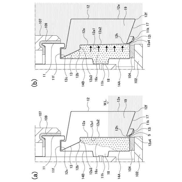 特に、この第2実施形態では、通気経路(VR)の中途部に水が溜まる貯留槽(11)を形成しており、この底(111)上に吸水性体積膨張材(8)が載置されている。そして、水が侵入し貯留槽(11)が水で満たされると吸水性体積膨張材(8)が膨張して、下垂部(12)と接触し、ここに形成されている通気経路(VR)を閉鎖して、水の床下空間(U)への侵入を阻止する構造が開示されている(図4参照)。