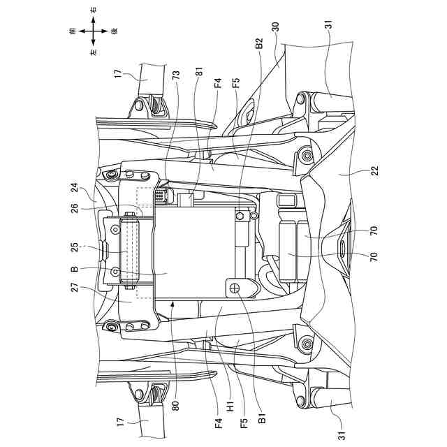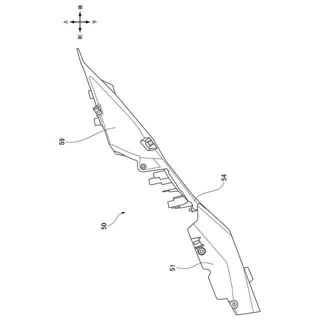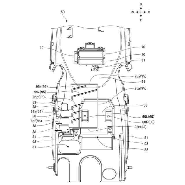 また、前記第2車体部品(72)は、レギュレータレクチファイヤ(72)であり、前記レギュレータレクチファイヤ(72)は、前記凹部(75)に設けられた支持腕(74)によって支持されており、前記リヤフェンダ(50)には、前記レギュレータレクチファイヤ(72)の前方の位置に開口(52)が設けられており、前記レギュレータレクチファイヤ(72)は、前記平面部(53)の水平面に対する前傾角度よりもさらに前傾して配設される点に第3の特徴がある。