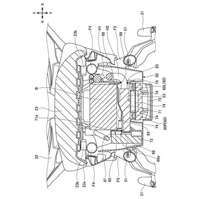 また、前記平面部(53)は、前記リアフェンダ(50)の一部が上方に隆起することによって形成され、前記平面部(53)の下面側は、上方へ窪む凹部(75)を構成し、前記凹部(75)に、前記車体部品のうちの第2車体部品(72)が配設される点に第2の特徴がある。
