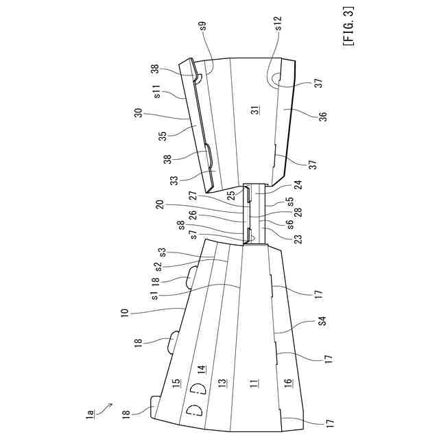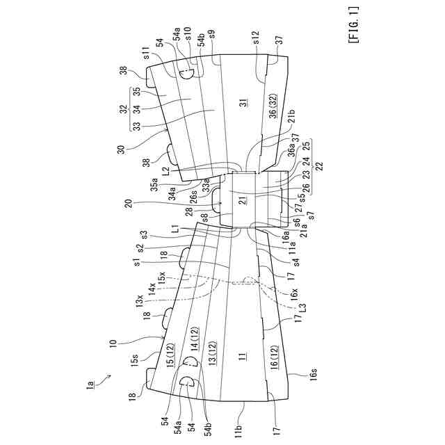 図1に示すように、本発明の音発生具のブランクシート(以下単に「ブランクシート」という)1aは、第1シート部10と、第1シート部10と折り曲げ線を介して連なっている第2シート部20と、第2シート部20と折り曲げ線を介して連なっている第3シート部30とを備えている。