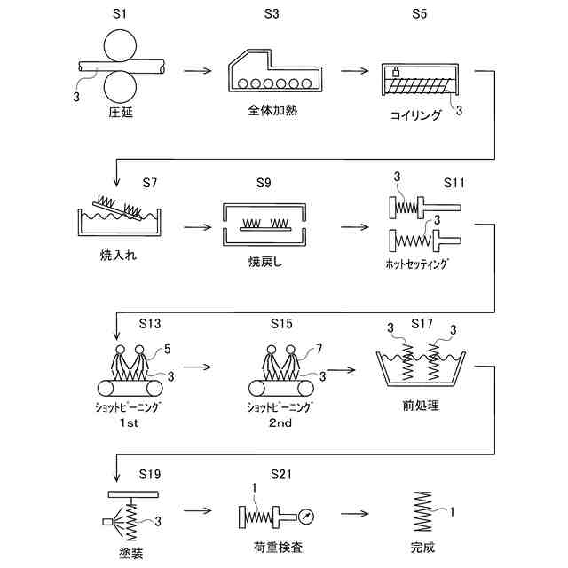 【解決手段】ショットピーニングを施す前の前処理を線材に施すショットピーニング前処理工程と、このショットピーニング前処理工程で前処理がされたコイル状の線材3に、球状に形成されており径の値が1.3mm以上であり硬度が570Hv以上である第1のメディア5を、速度70m/sec以上で投射し、第1のショットピーニングを施す第1のショットピーニング工程S13と、第1のショットピーニング工程S13での処理が施されたコイル状の線材3に、球状に形成されており径の値が第1のメディア5の径の値よりも小さい第2のメディア7を、第1のショットピーニング工程S13での速度よりも遅い速度で投射し、第2のショットピーニングを施す第2のショットピーニング工程S15とを有する。