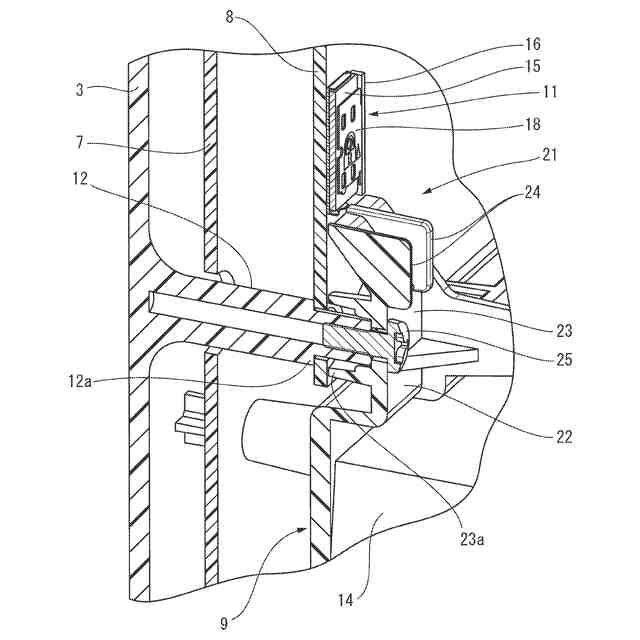 本発明は、前記開き角度規制構造において、前記開き角度規制部材は、前記第1のケースの下方近傍で前記開閉軸の軸線方向に延びるとともに上下方向に延びる基部を有し、前記当接部は、上下方向および前記壁に垂直な方向に延びる板状に形成されて前記基部に凸設され、前記基部における前記当接部と隣合う部分には、上方に向かうにしたがって次第に前記壁に近付くように傾斜する傾斜面が形成されていてもよい。