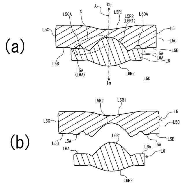 このうち、特に樹脂材料製のレンズ(プラスチックレンズ)は、やはり樹脂材料製である鏡筒に対して圧入されて固定される。このようなプラスチックレンズの形態として、特許文献1に記載されるような接合レンズがある。接合レンズは、2枚のプラスチックレンズが接着剤で接合されて構成され、これらにおける対向するレンズ面は共通の形状とされる。こうした接合レンズは、少ない枚数で色収差の補正を行う上で特に有効である。