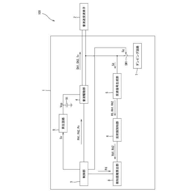 音波送受波素子2は、いわゆる、圧電素子である。音波送受波素子2は、その両端間に印加される電圧信号に応じて機械的変位(振動)を生じる特性を持ち、搬送波の送波できる。また、音波送受波素子2は、自身に加わる機械的変位(振動)に応じてその両端間に起電力を生じる特性を備える。音波送受波素子2は、この起電力を生じる特性を利用して、検知対象物600で反射した反射波を含む音波Sd(図2参照)を受波できる。