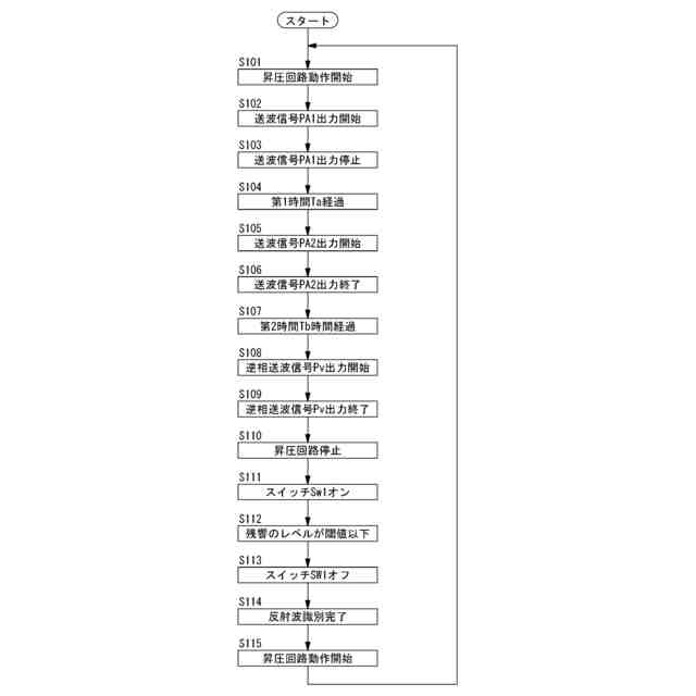 【解決手段】音波センサ(109)を駆動する音波センサ駆動回路(1)において、制御部(3)は、昇圧回路(9)を駆動させた状態で、音波駆動部(4)から所定の第1パルス数の第1駆動信号(DA1)を生成させ、昇圧回路(9)の駆動を維持したまま一定期間(Ta)経過後、音波駆動部から所定の第2パルス数の第2駆動信号(DA2)を生成させた後、音波駆動部(4)から所定の第3パルス数の前記第2駆動信号(DA2)と逆相の逆相信号(Iv)を生成させる。