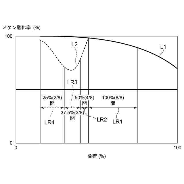 内燃機関の負荷とメタン酸化率とダンパの開閉数の関係を説明するための説明図である。