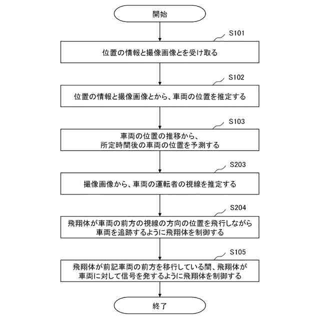 特許文献1の技術では、無人飛行体が走行する車両の進行方向前方を飛行できる。しかし、特許文献1の技術では、無人飛行体は、車両の位置と無人飛行体の飛行目標位置とを受け取る必要がある。一般に、逃走する車両は、その車両を追跡する無人飛行体に、車両の位置と飛行目標位置とを提供しない。特許文献1の技術は、逃走する車両の追跡に使用できない。