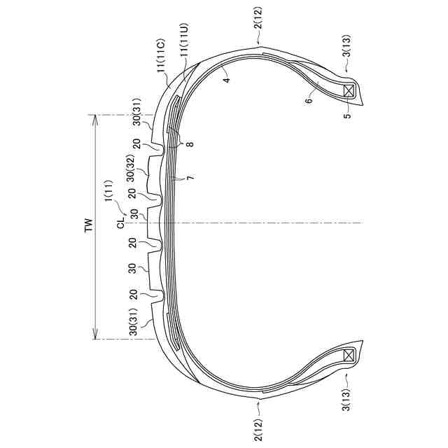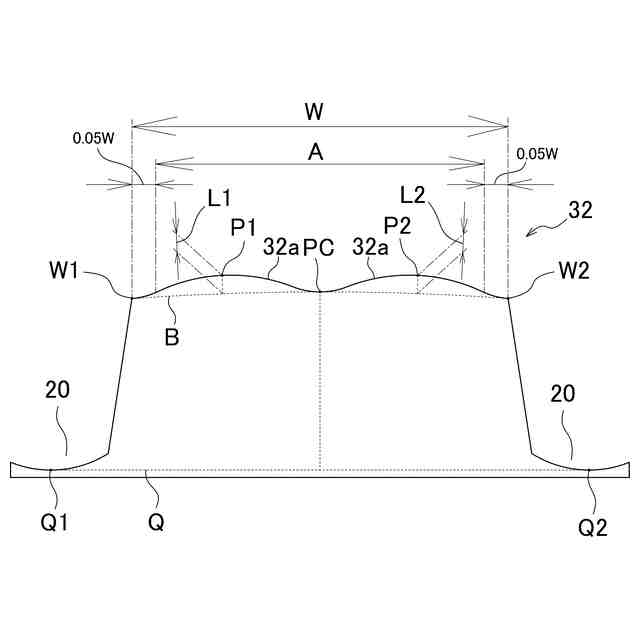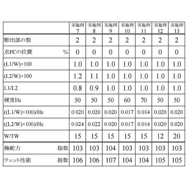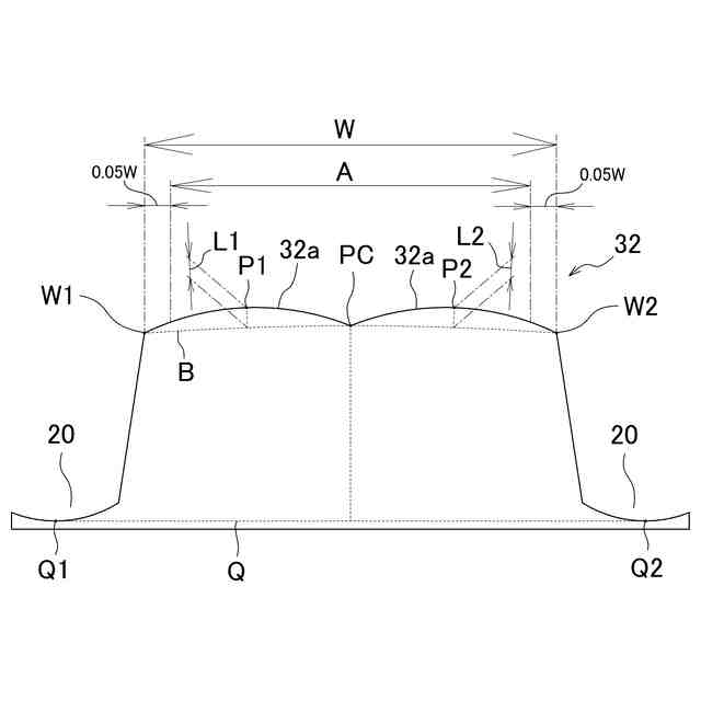 本発明においては、点W1と点W2と点PCとを結んだ円弧を基準プロファイルBと定義し、点W1と点PCとの間の領域で基準プロファイルBとの垂直距離が最も大きくなる凸リブの輪郭線上の点を点P1とし、点W2と点PCとの間の領域で基準プロファイルBとの垂直距離が最も大きくなる凸リブの輪郭線上の点を点P2としたとき、点P1と基準プロファイルBとの垂直距離L1と、点P2と基準プロファイルBとの垂直距離L2と、凸リブ幅Wとが、0<(L1/W)×100≦6かつ0<(L2/W)×100≦6の関係を満たすことが好ましい。このように凸リブ幅Wに対する膨出量を適度な範囲に設定することで、2列の膨出部の形状を良好に維持することができ、水膜を切りやすくしてウェット性能を向上する効果を高めることができる。