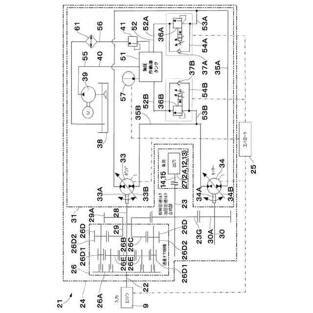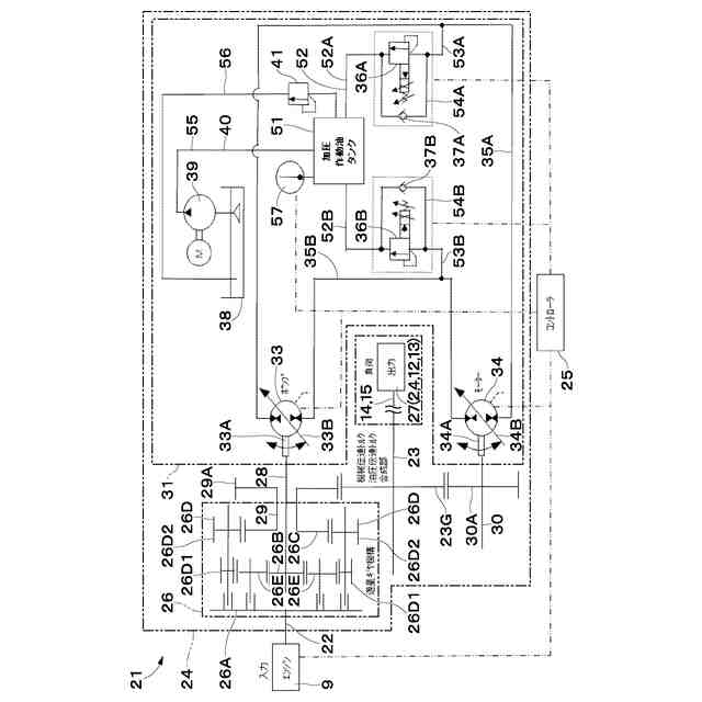 ところで、HMTは、低速回転中(低速走行中)に遊星歯車機構の第2要素からHSTの油圧ポンプに出力されるトルクをこの油圧ポンプで十分に受けることができれば、遊星歯車機構の第3要素から出力されるトルク、延いては、HMTの出力トルク(駆動力)を確保できる。例えば、HSTの油圧ポンプが受け止められるトルクを大きくするために、この油圧ポンプの容量をHMTの狙いの変速比に相当する容量よりも大きくし、かつ、HSTの閉回路内の圧力を確保しつつ、可変リリーフ弁で作動油を必要量リリーフすることにより、低速回転中の出力トルクを確保することが考えられる。しかし、この場合、作動油の可変リリーフ弁の通過によりHSTの作動油が短時間で高温に達するおそれがある。