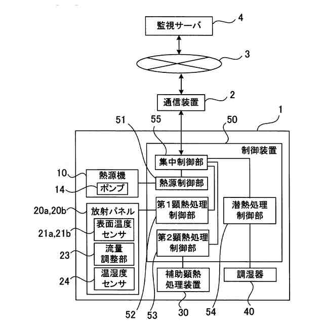 【解決手段】 液状の熱媒体を加熱または冷却して循環流路11を循環させる熱源機10と、循環流路11を流れる熱媒体を利用して空調空間101の放射空調を行う放射パネル20aと、循環流路11から分流した熱媒体により放射パネル20aによる空調区間101の顕熱処理を補う補助顕熱処理装置30と、空調空間101の潜熱処理を行う調湿器40と、放射パネル20aおよび補助顕熱処理装置30による顕熱処理を制御する制御装置とを備える空調システム1である。