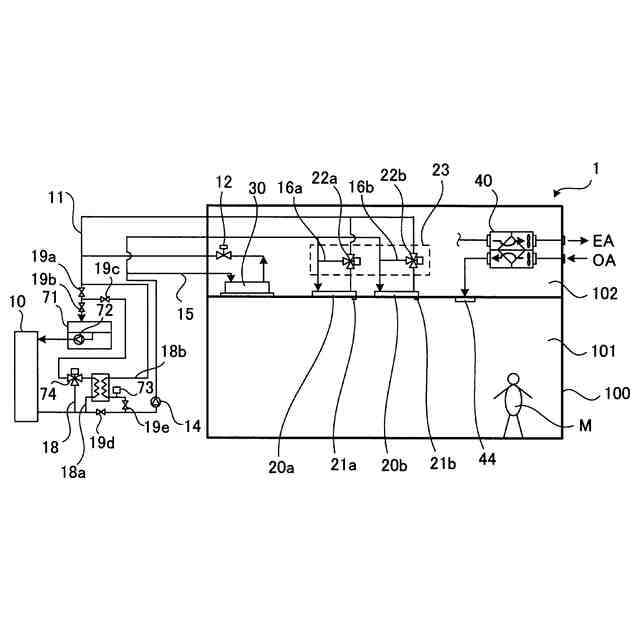 建築物の室内空間の空調を行うシステムとして、例えば、特許文献1に開示された構成が知られている。この放射空調システムは、放射パネルおよび調湿換気装置を備えている。放射パネルは、パネル本体に供給される熱媒体の流量等を調整することにより、パネル本体の表面温度が所定温度に制御される。また、調湿換気装置は、調湿ユニットにおいて、導入した外気と冷水との熱交換を行うことにより、室内の温度および湿度が制御される。